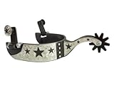Antique brown color western show spurs, Beautiful hand engraved silver overlay with cut out stars and silver dots. Ladie's size, 3 ⅛" opening, 3 �" deep.